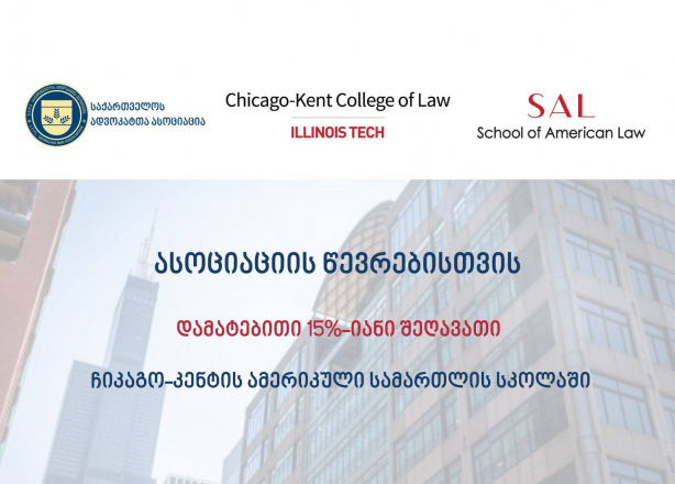 ჩიკაგო-კენტის ამერიკული სამართლის სკოლა, საქართველოს ადვოკატთა ასოციაციასთან გაფორმებული ურთიერთთანამშრომლობის ფარგლებში, ასოციაციის წევრებს სთავაზობს სწავლას ამერიკულ სამართლის სკოლაში 15%-იანი ფასდაკლებით.