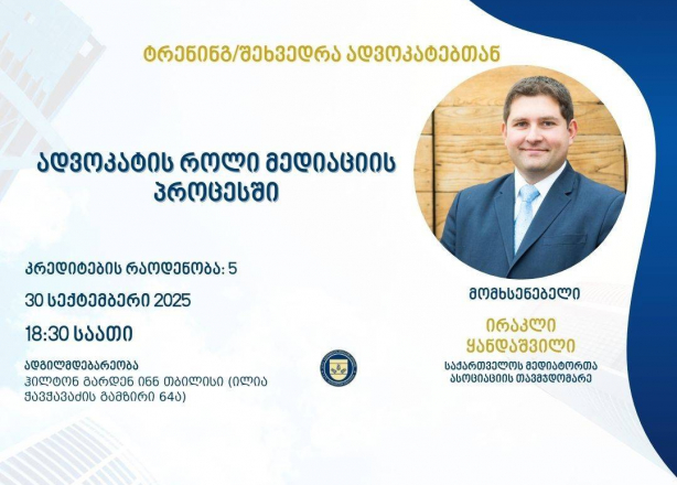 30 სექტემბერს,18:30 საათზე, საქართველოს მედიატორთა ასოციაცია საქართველოს ადვოკატთა ასოციაციის, გაეროს განვითარების პროგრამისა და გერმანიის მხარდაჭერით ადვოკატებთან ტრენინგ/შეხვედრას ჩაატარებს თემაზე: "ადვოკატის როლი მედიაციის პროცესში".